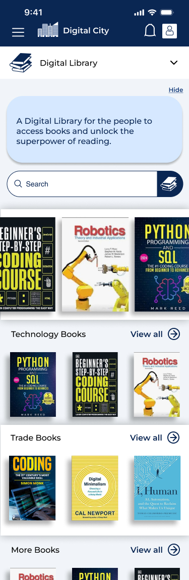 - It contains the “Digital Bookshelf” which takes them to the main user platform to search and buy books.