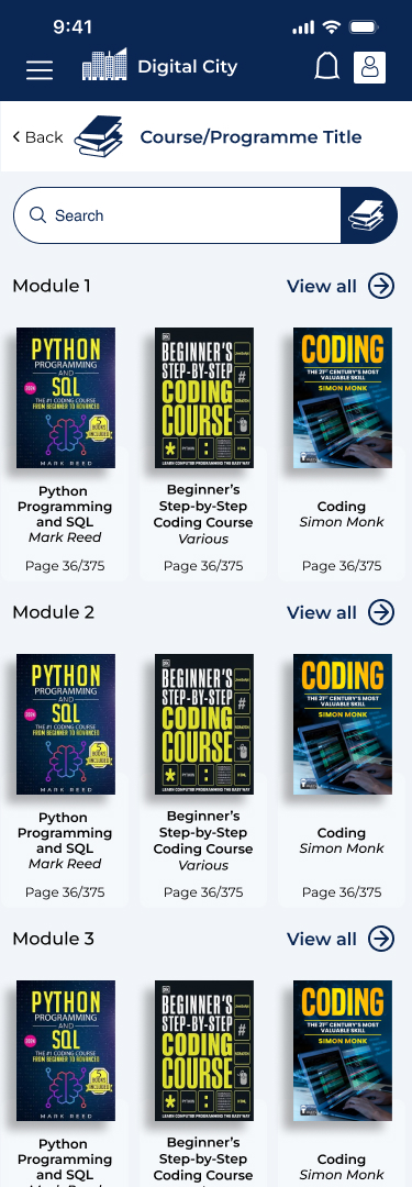 2- User can toggle through the different modules of a course or programme to find the right book they need to reference or read.