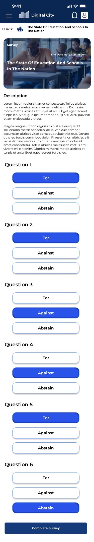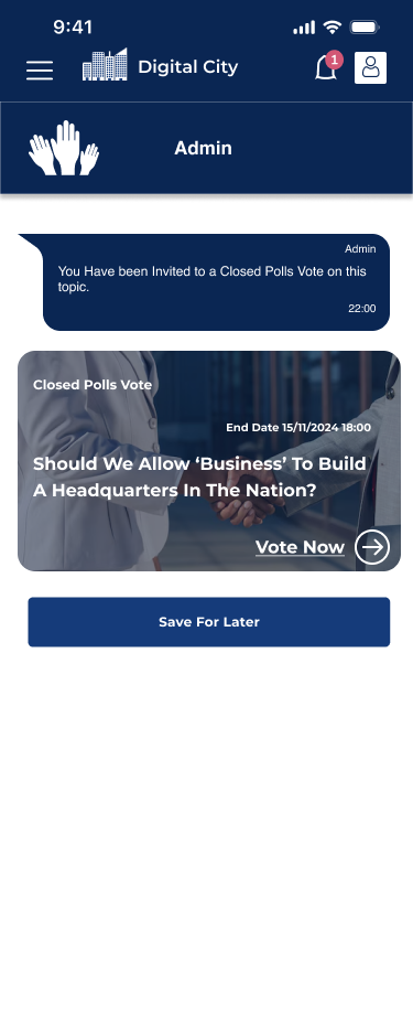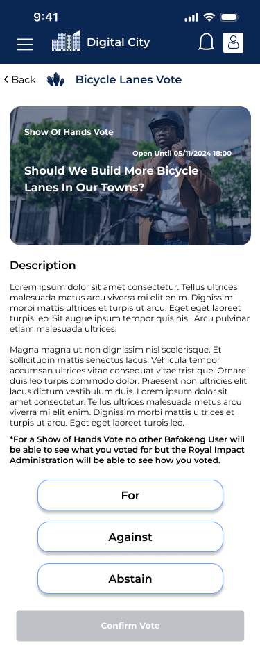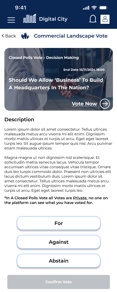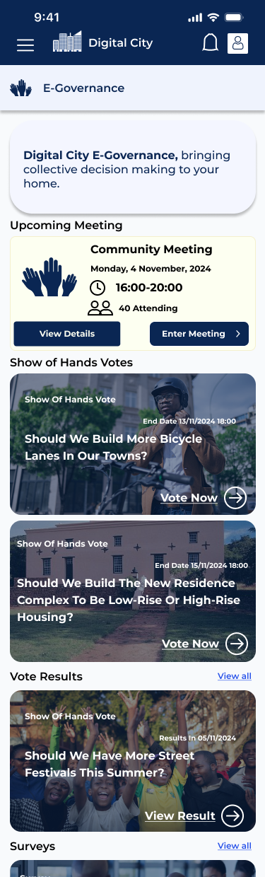 - These will all be localized so the users will see only votes and surveys that concern their direct community or if the entire nation needs to participate.