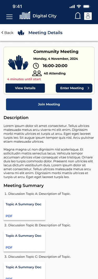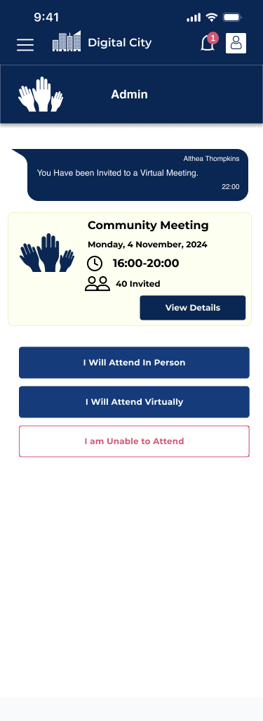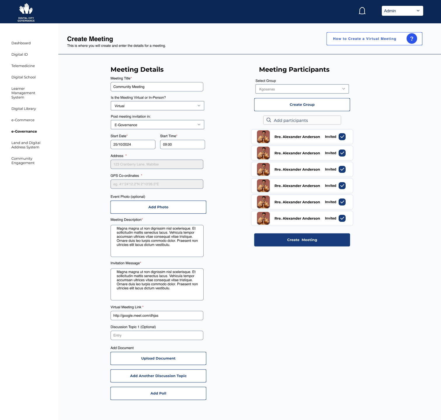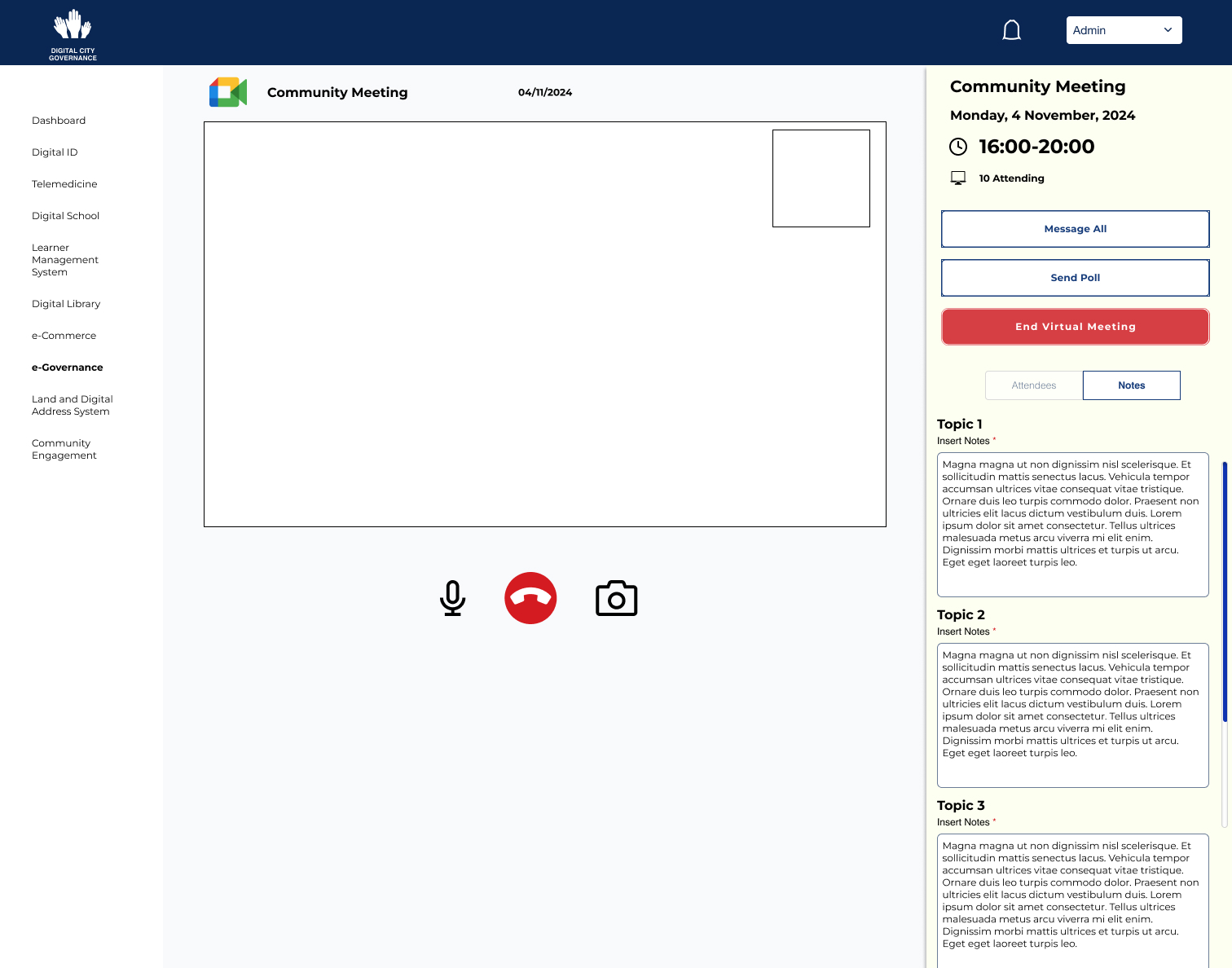 Another main function of the E-Governance platform is to host and invite people to community meetings. These meetings may be in-person but will also be live streamed for community members who cannot make it to the meetings.