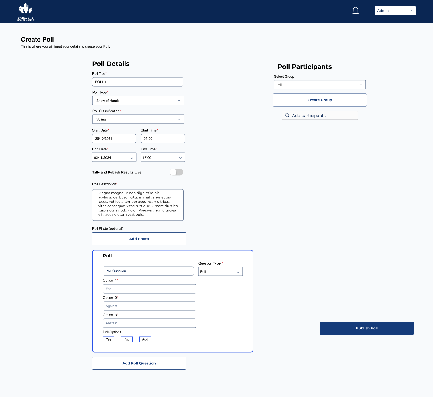 - Creates the Poll Question. (Can Add questions if it is several issues)